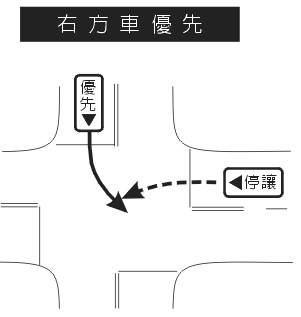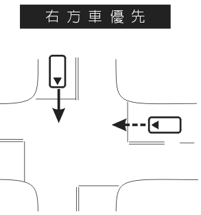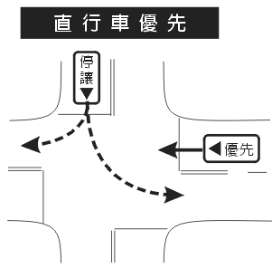二 車輛行至無號誌或號誌故障而無交通警察指揮之交岔路口,支線道車應暫停讓幹線道車先行。未劃分幹、支線或同為幹線道或支線道者,轉彎車應暫停讓直行車先行;如同為直行車或轉彎車者,左方車應暫停讓右方車先行。 |
