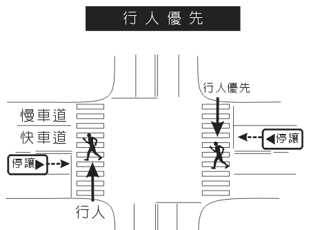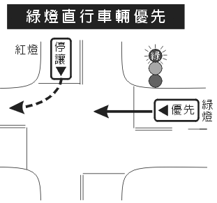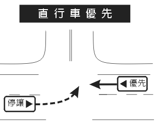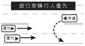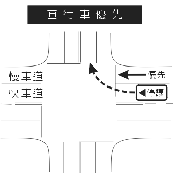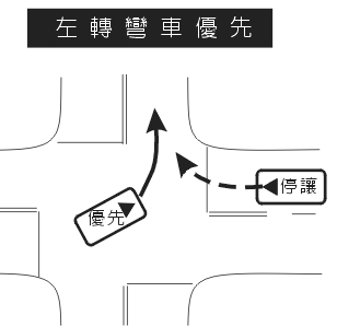 六 轉彎車應讓直行車先行。但直行車尚未進入交岔路口,而轉彎車已達中心處開始轉彎,直行車應讓轉彎車先行。 |