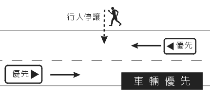 二、行至無號誌或號誌故障而無交通指揮人員指揮之交岔路口,支線道車應暫停讓幹線道車先行。未設標誌、標線或號誌劃分幹、支線道者,少線道車應暫停讓多線道先行;車道數相同時,轉彎車應暫停讓直行車先行;同為直行車或轉彎車者,左方車應暫停讓右方車先行。但在交通壅塞時,應於停止線前暫停與他方雙向車輛互為禮讓,交互輪流行駛。 |